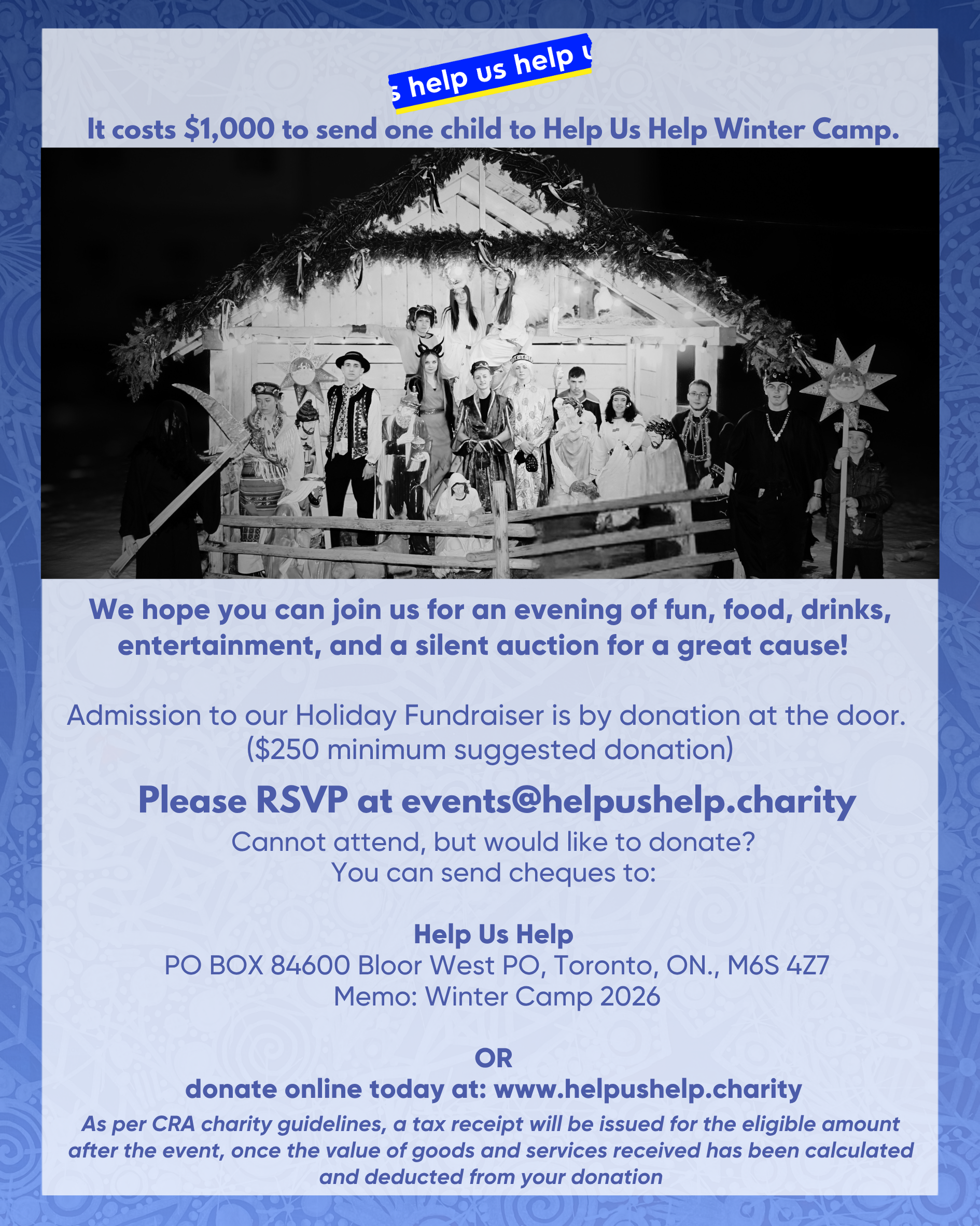 Help Us Help is proud to host our annual Send a Child to Winter Camp fundraising event on Friday, November 21, 2025, at Defina Woodfired (1485 Dupont Street, Toronto), from 7:00pm onwards.